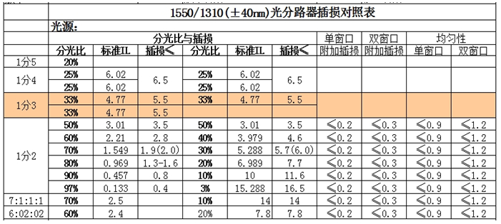 单模分光器技术参数