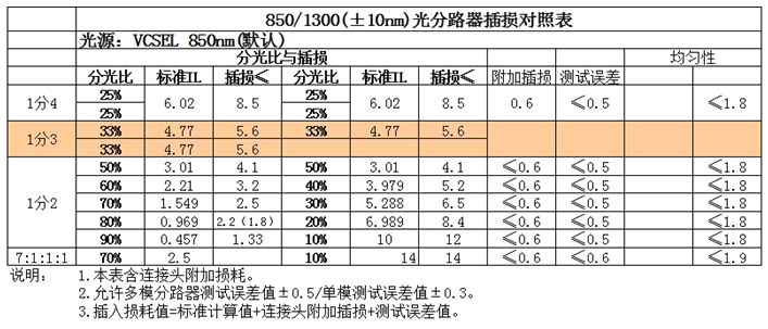 多模分光器技术参数